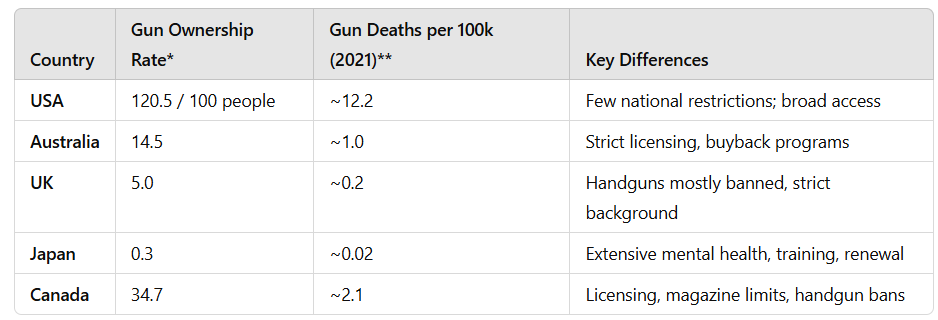 👉 Context matters: The U.S. has a unique history of frontier culture, revolution, and constitutional protections. Other countries have different historical paths and legal systems, which shape their gun policies.